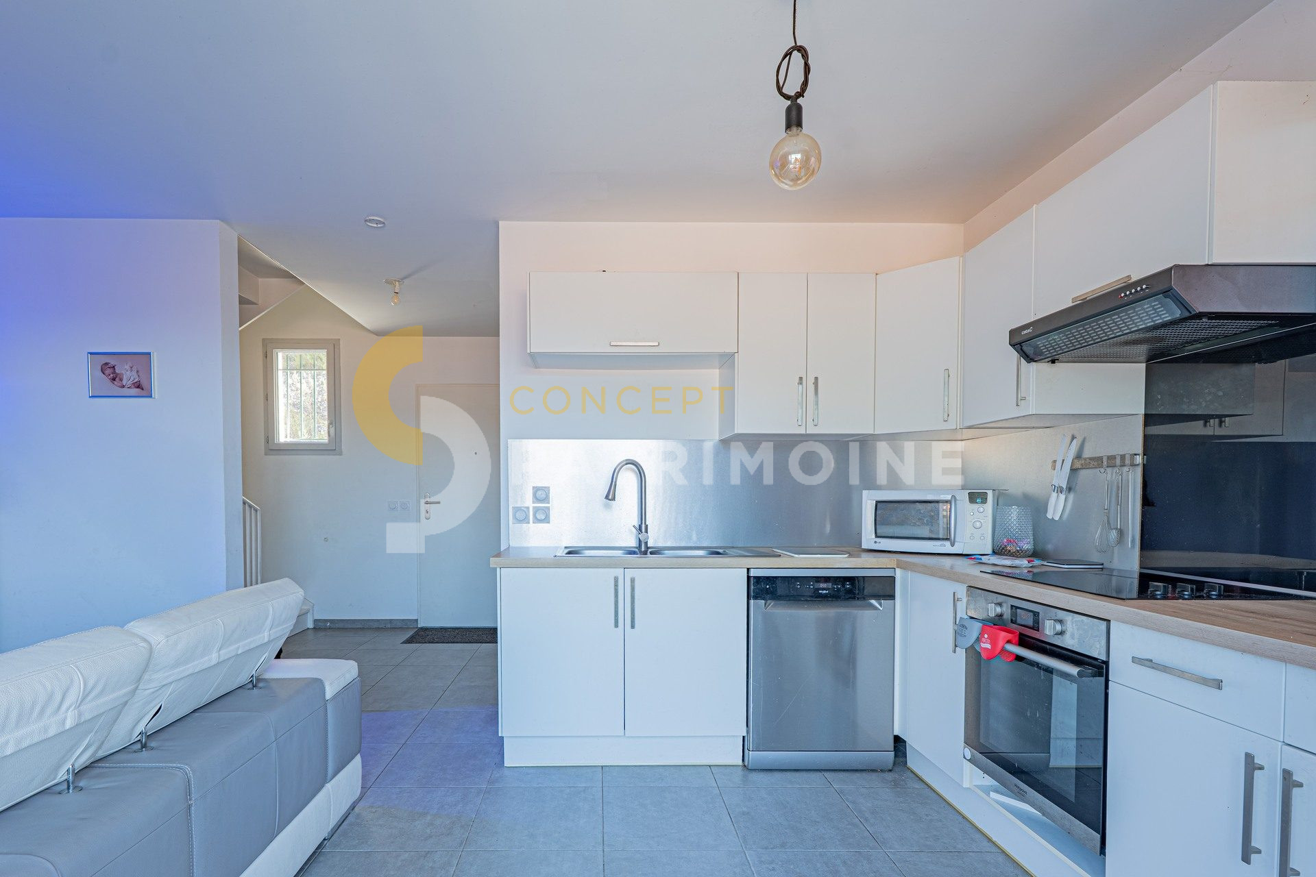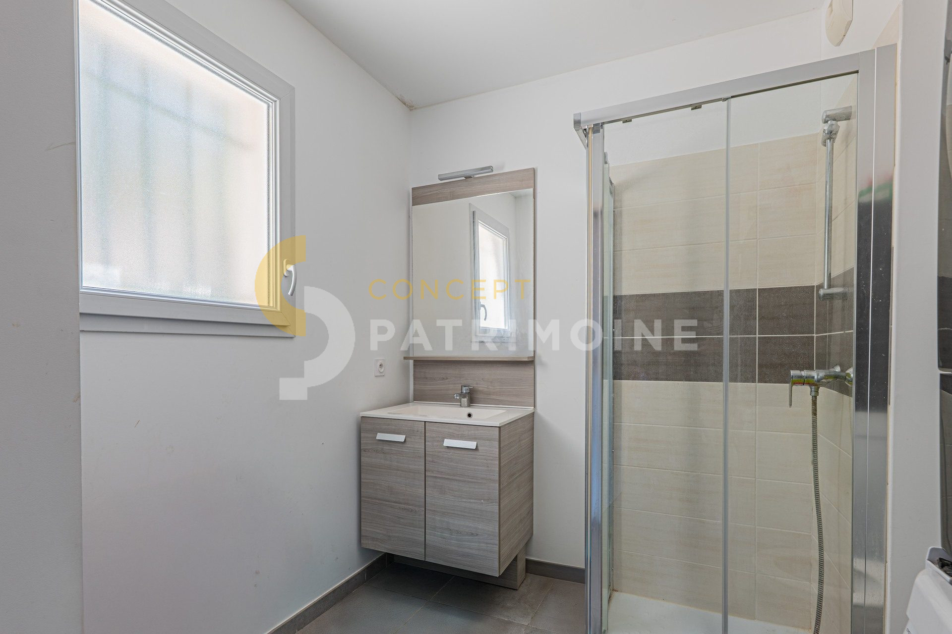 En rez-de-chaussée: un séjour avec cuisine américaine aménagée donnant sur une terrasse et une salle de douche.