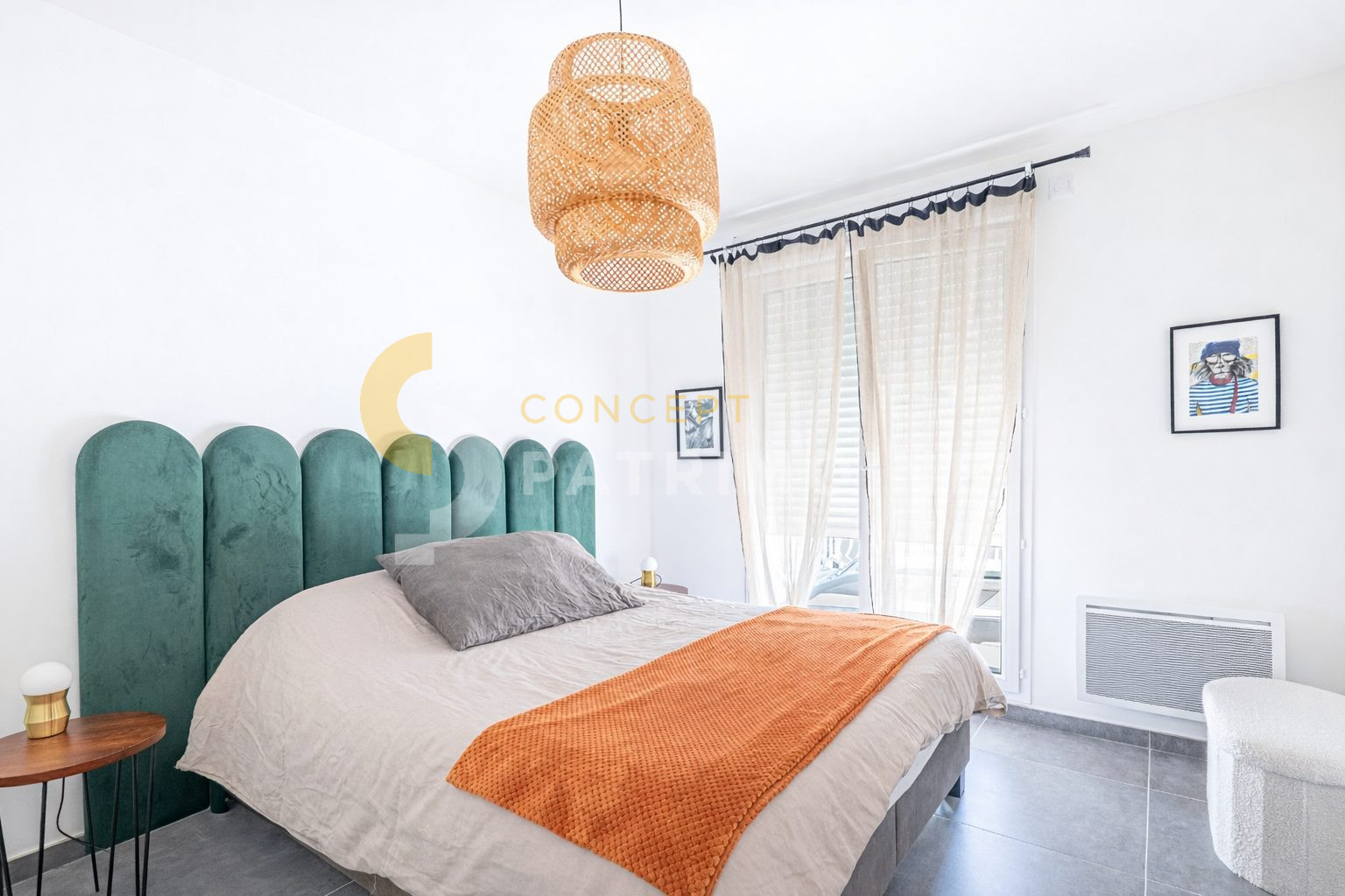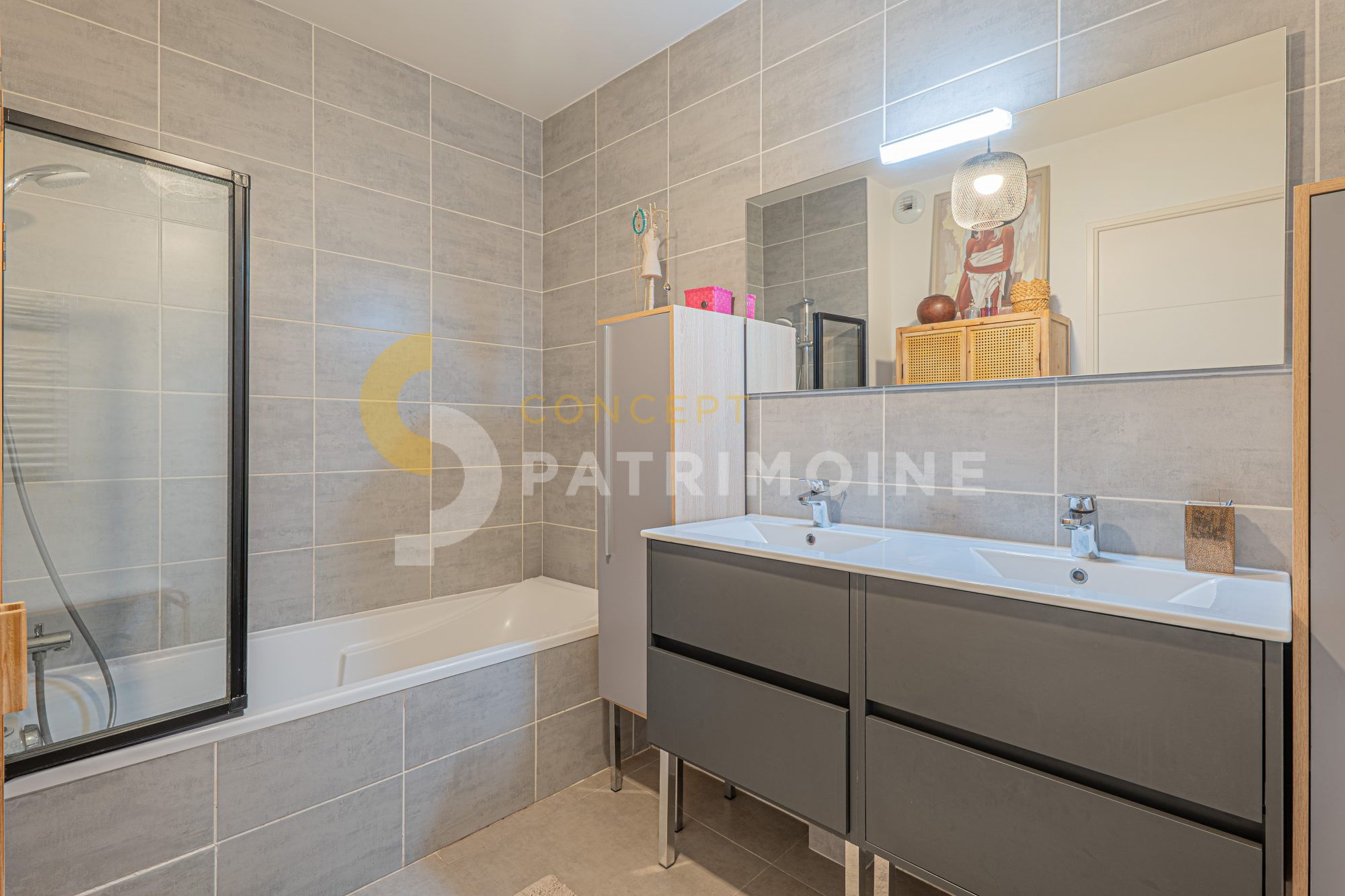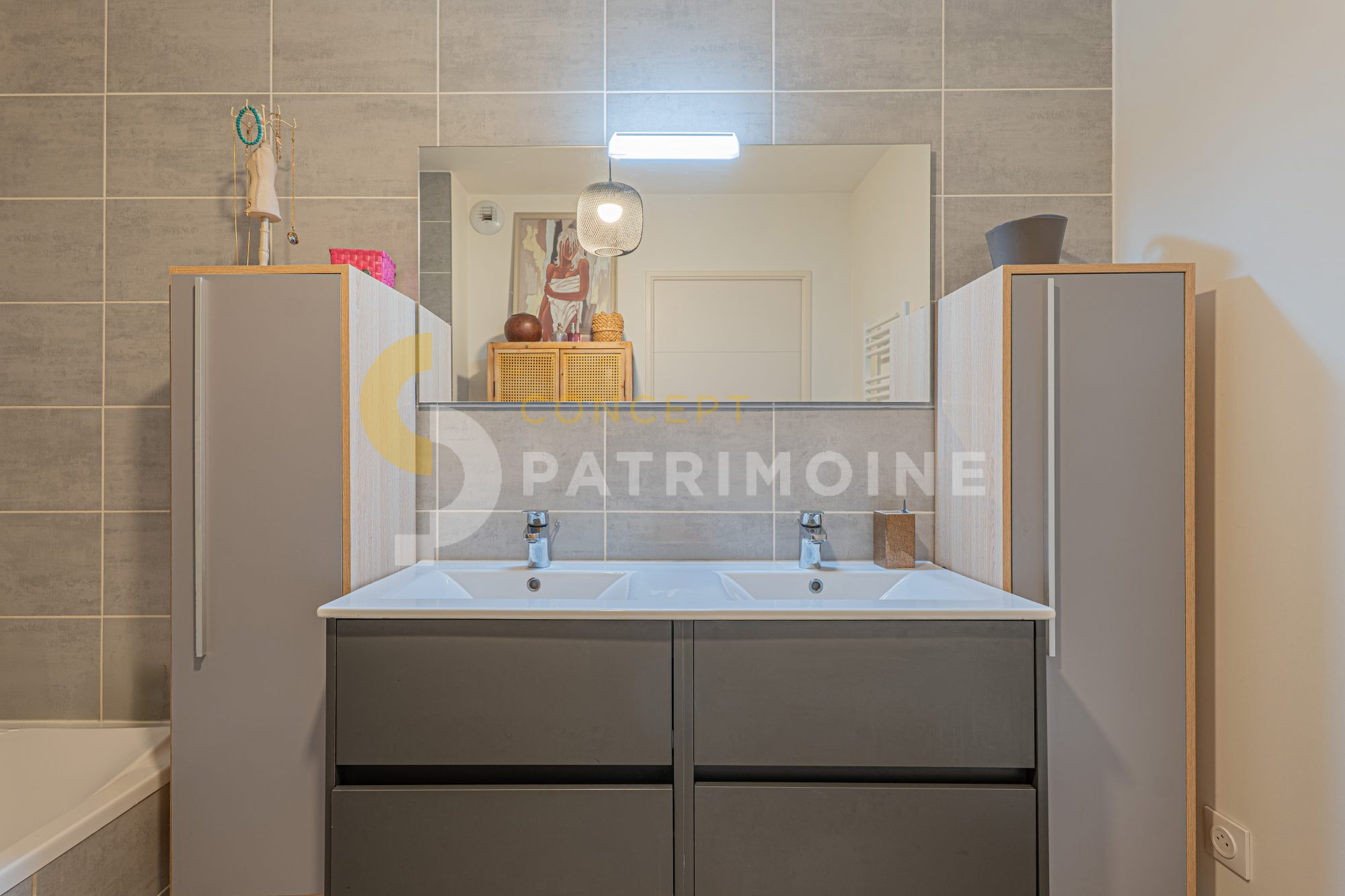 Côté nuit, vous trouverez deux chambres spacieuses avec placards, une salle de bains avec double vasque, un WC indépendant, ainsi qu’une buanderie.