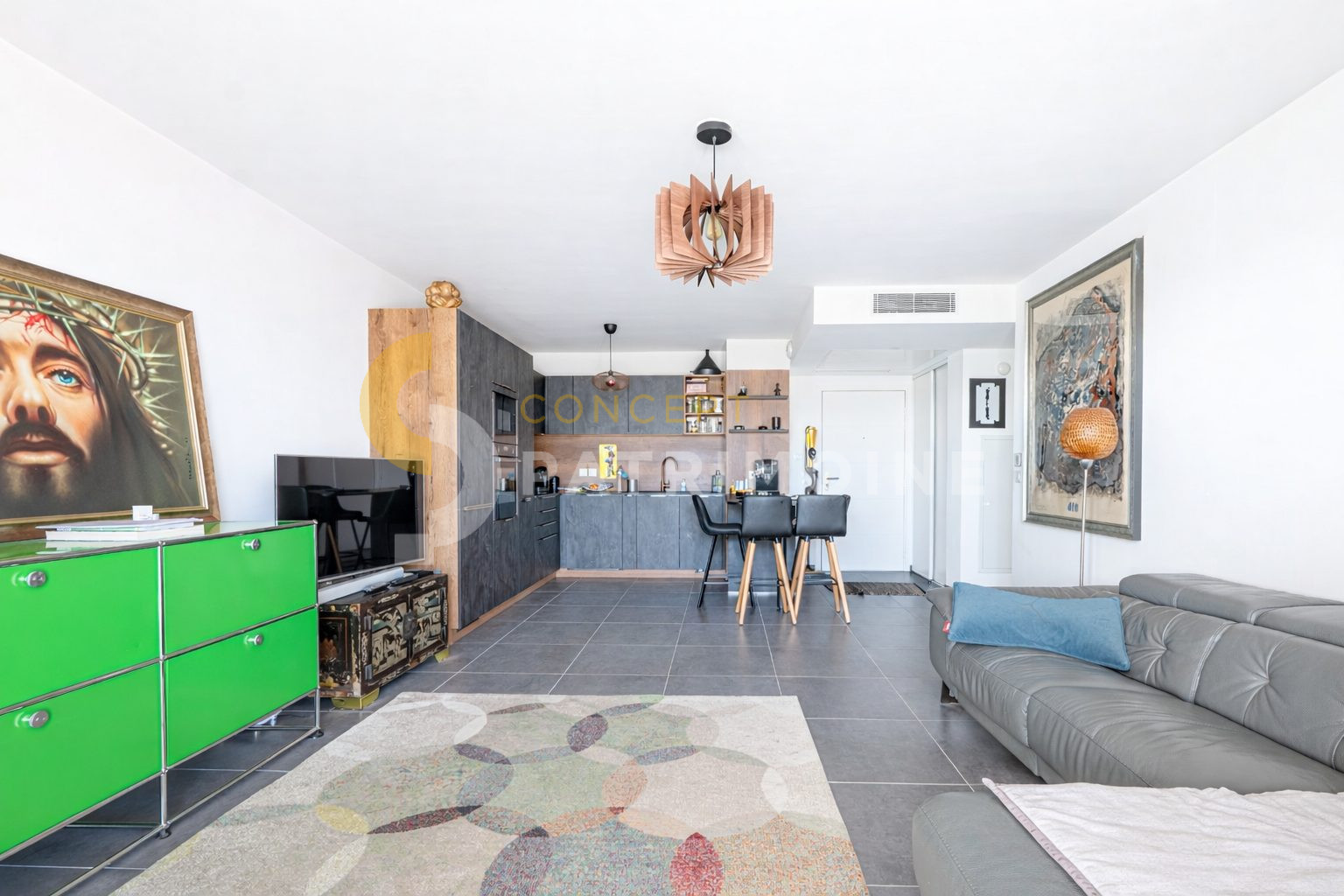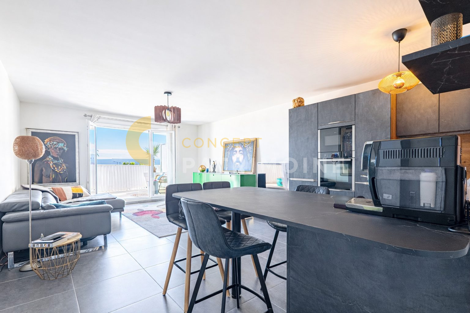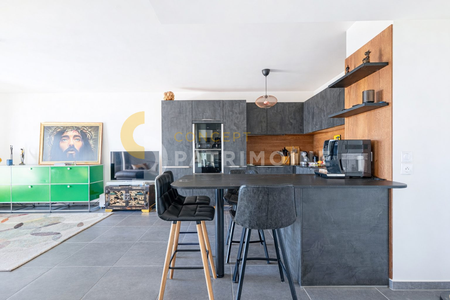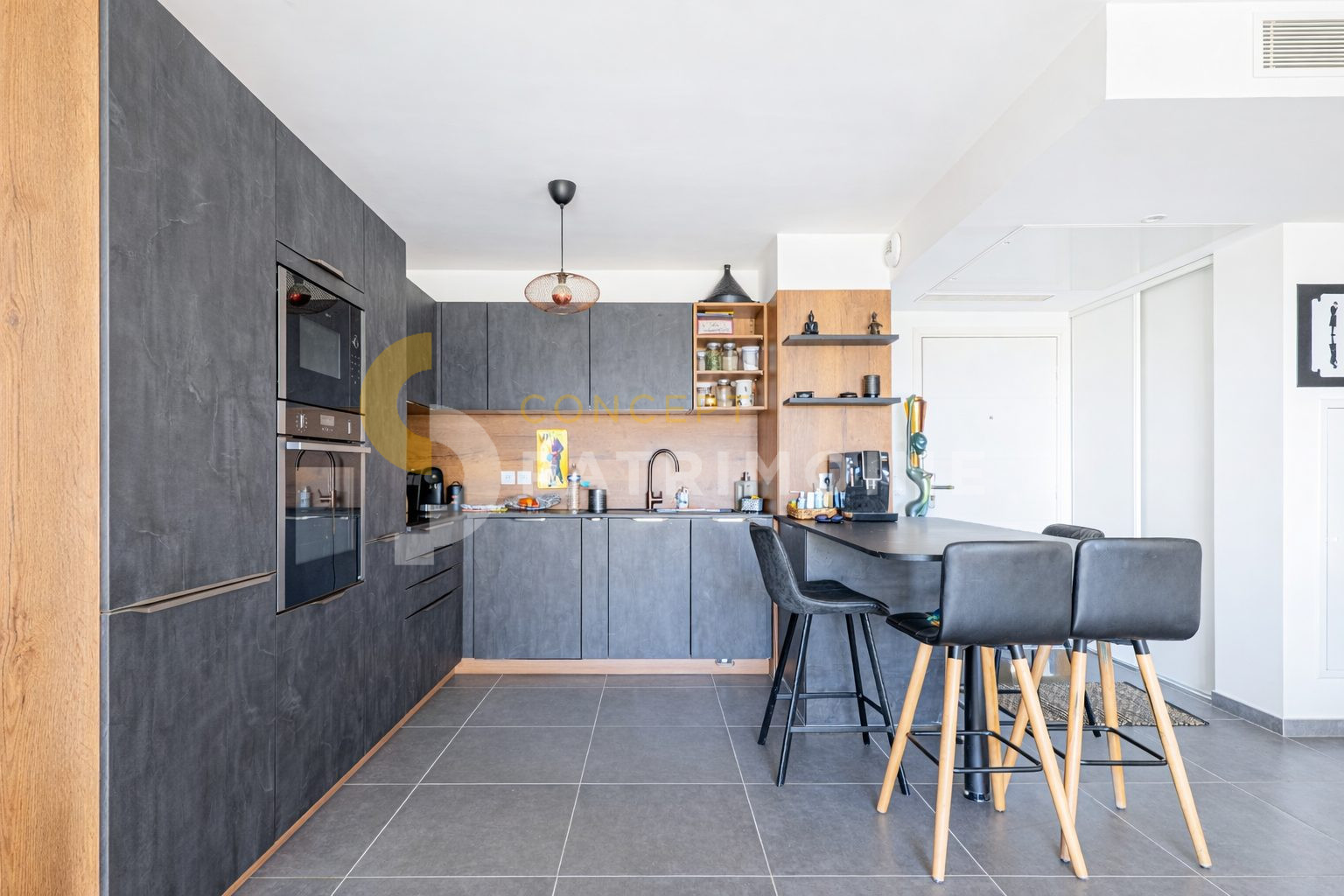 L’appartement se compose d’un séjour avec cuisine ouverte, spacieux et lumineux, entièrement équipée et aménagée (marque SCHMIDT), pensé pour un quotidien fonctionnel et élégant.
