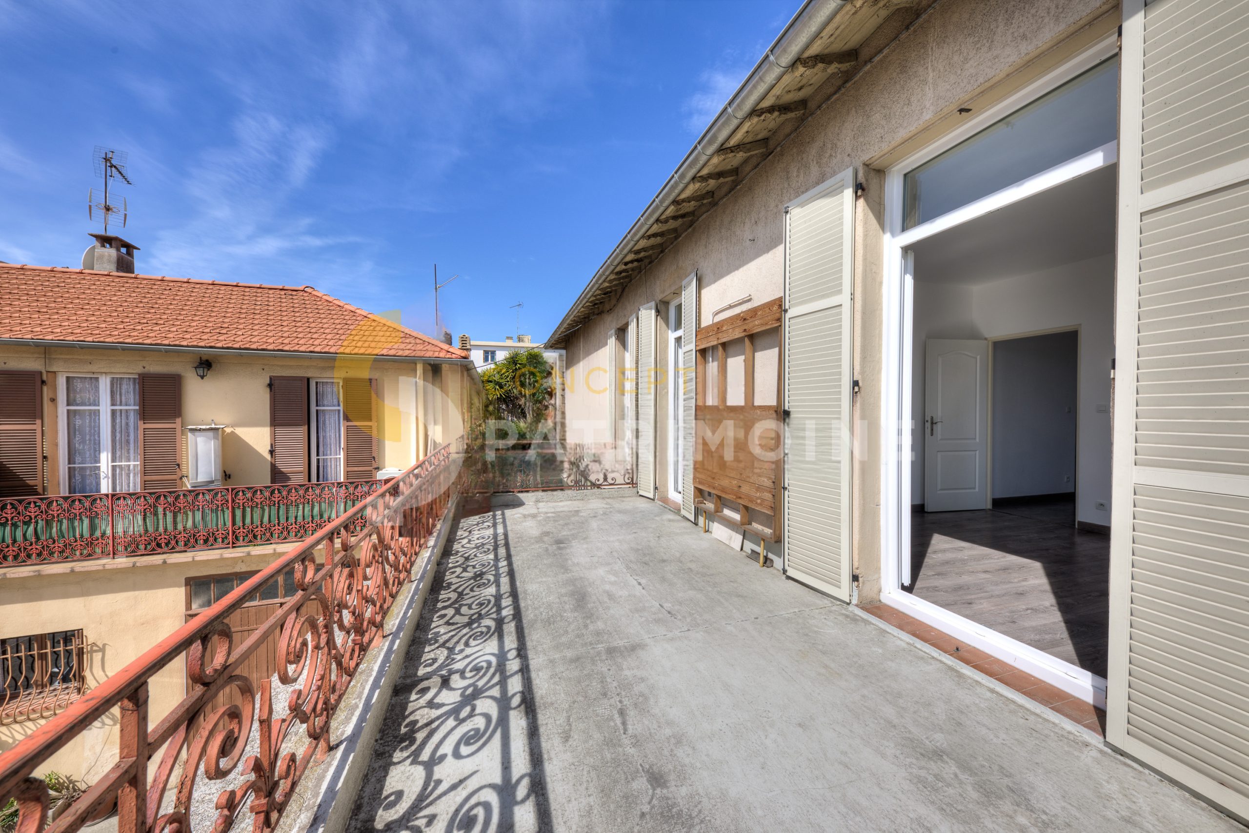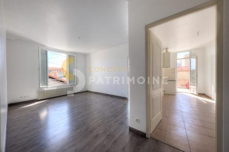 // CENTRE VILLE// Avenue Bellevue proche de toutes les commodités, au 1er et dernier étage d'une petite copropriété sans ascenseur un appartement de type 3 pièces de 60 m² au calme, composé d'un hall, une cuisine aménagée et semi équipée (plaque de cuisson et hotte) un séjour, 2 chambres, une salle de douche avec WC et une terrasse de 17.6 m²